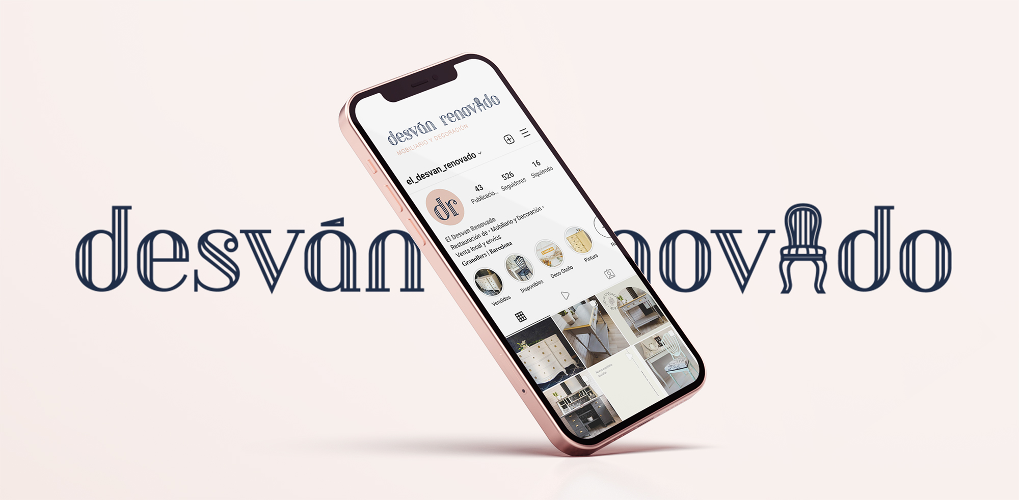 The typography of the logo has a retro style given by the lines, but with a classic serif shape. The chair substituting the «A» on «Renovado» gives context, specifying its about vintage furniture. The tagline with a sans serif typography gives the renovated aspect of their products, with a more simplified look, from old brown and over-decorated with colored flowers for a clean and simple white with gold touches.
