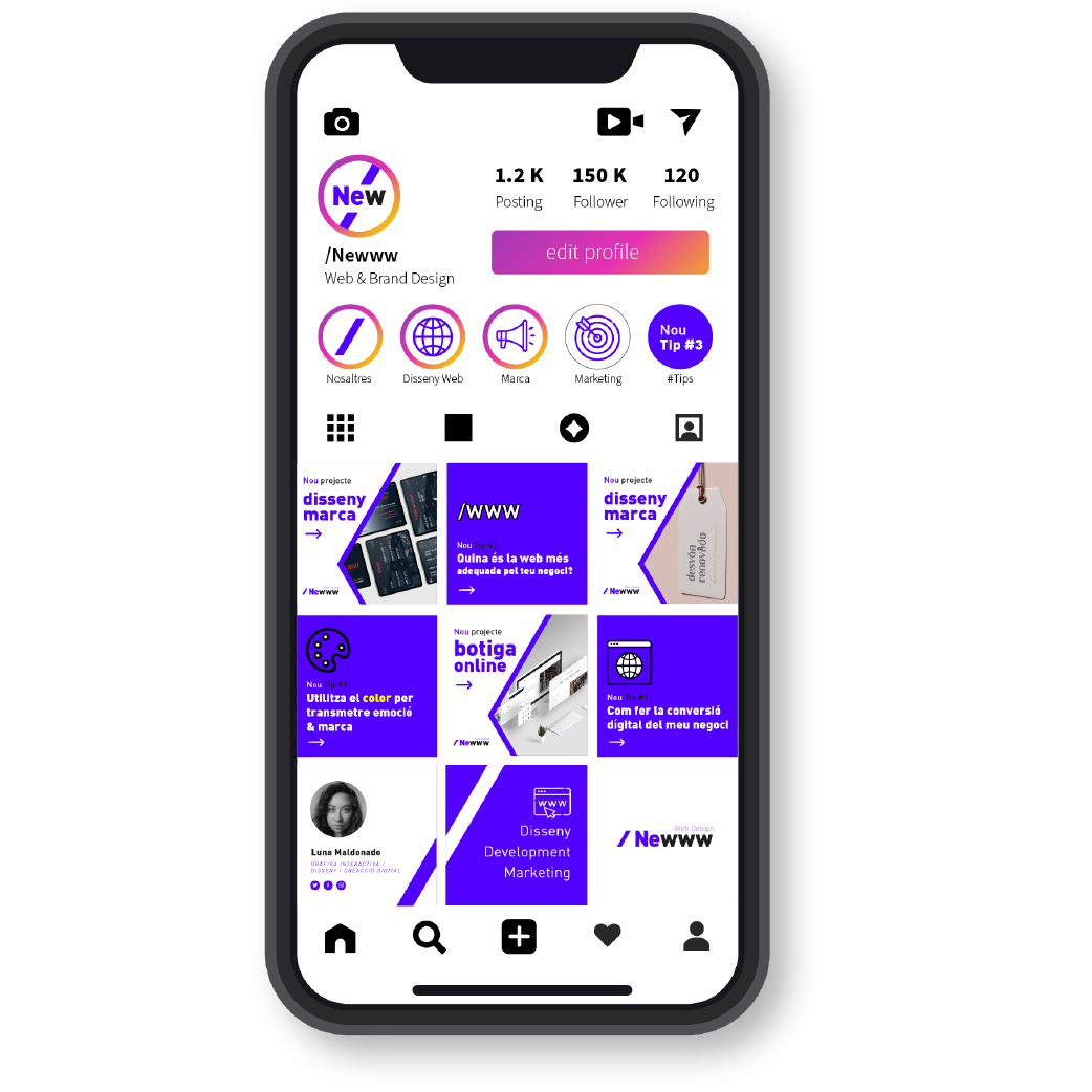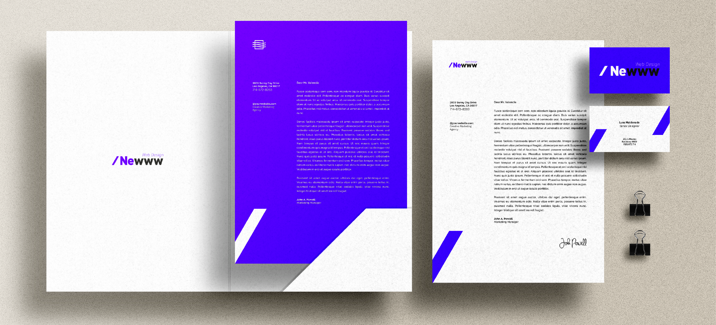 /Newww is a design agency specialized in website design, I created this passion project to develop a brand design with a very modern, up-to-date image that would represent their work. This is achieved with a typography with a bold look and straight lines is complemented with a vibrant purple as the main brand color.